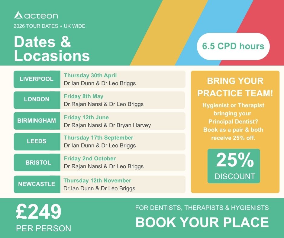 Perio Reload 2026 is a UK-wide roadshow designed to help dental professionals rethink, refine and elevate their periodontal approach. Through a combination of expert-led lectures, clinical case discussions and hands-on workshops, delegates will gain practical skills in minimally invasive techniques, modern instrumentation and patient management. Focused on real-world application, the course equips clinicians to deliver more predictable outcomes while improving patient experience and safeguarding clinical practice.